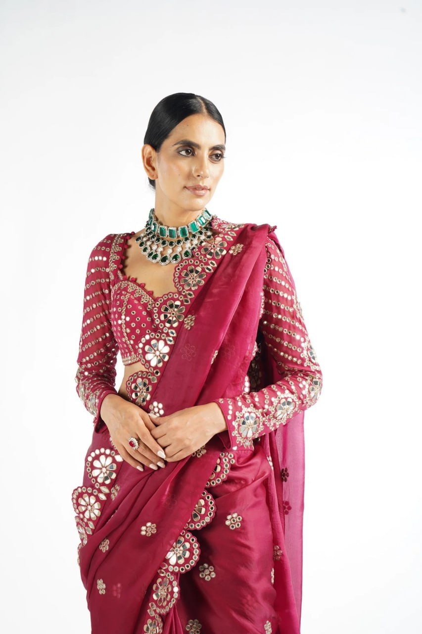 Saree: Heavy Soft Georgette with beautiful embroidery, sequins, coding work, and original real mirror detailing.Blouse: Heavy Soft Mono Banglory Silk with matching embroidery, coding, and sequins work.
